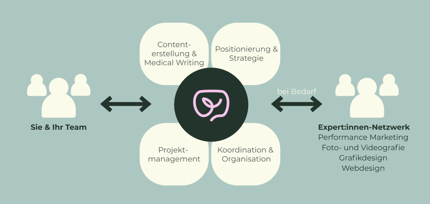 Ich verbinde Strategie, Medical Writing und Projektkoordination – und hole bei Bedarf gezielt Expert:innen aus meinem Netzwerk dazu, z. B. aus Design oder Marketing.